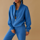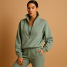 This two-piece set for women features a relaxed fit and a half-zip design, creating a modern casual look suitable for everyday wear. The loose silhouette allows easy movement, making it practical for lounging or active days. Its simple styling makes it versatile for both home and casual outings. Available in various shades, it complements different personal styles. Suitable for year-round use.