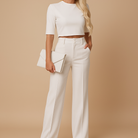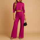 thisen is the perfect combination of comfort and elegance for autumn. This two-piece set consists of a cropped top and tailored pants with an elastic waistband, ideal for a flattering fit. The soft and warm fabric makes it suitable for chilly days, while the stylish design can easily be worn for both work and leisure. Wear it as a set or mix with your favorite basics for a versatile fall look.