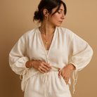 Discover the perfect balance between chic and comfort with this, a stylish set consisting of a feminine V-neck top and shorts with ruffles. The top with adjustable sleeves offers a relaxed fit that flatters every body type. The airy shorts with a stretch waistband and playful ruffles provide effortless comfort. This set is ideal for both a relaxed day at home or a summer night out, letting you shine without compromising on comfort.