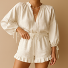 • Design: V-neck top with drawstring sleeves and ruffled shorts