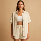 Relax in style with this, a breezy two-piece women's summer set featuring a half-length cardigan and drawstring shorts. The solid colors provide a modern, calm appearance, making it easy to pair with slippers, sneakers, or sandals. Perfect for casual days, beach walks, or relaxing moments at home.