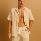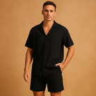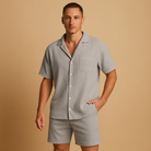 this is a stylish summer set for men, designed to keep you fresh and well-groomed during warm days. Featuring a classic V-neck shirt with lapel collar and elastic shorts with adjustable waistband, this set is ideal for casual outings, relaxing at home, or summer walks. The practical side pockets make it extra functional for everyday use.
