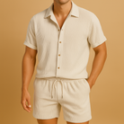 this is a stylish summer set for men featuring an eye-catching striped design that is perfect for warm, sunny days. The lightweight short-sleeved top and comfortable shorts offer a breezy and relaxed fit—ideal for any summer occasion. Thanks to its vibrant colors and modern look, you’ll effortlessly stand out, whether you're relaxing on a terrace, strolling along the beach, or wandering through the city.