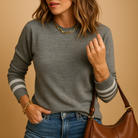 Add timeless style to your wardrobe with this, an elegant knitted women's sweater featuring bold striped sleeves for a modern twist. The relaxed fit flatters the figure and provides all-day comfort, while the breathable material makes it perfect for the transitional seasons. Whether you choose jeans, leggings, or a skirt, this gives every outfit a stylish and versatile look.