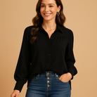 Combine style and sophistication with this, an elegant blouse with lantern sleeves for women, perfect for both work and leisure. The solid design and gathered details give this blouse a refined look, while the lightweight fabric ensures comfort in every season. Ideal for a professional look or a stylish casual outfit – this effortlessly adapts to any occasion.
