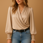 This women’s top features a classic V-neck design with long sleeves and a smooth, relaxed fit. The lightweight structure makes it suitable for layering or wearing on its own throughout the year. Its versatile style pairs easily with skirts, jeans, or tailored trousers for both casual and smart outfits. Available in sizes S to XL, it’s a timeless and adaptable wardrobe piece.