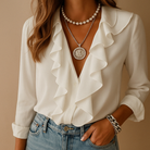 Add a touch of elegance to your outfit with this, a stylish blouse with ruffles and butterfly print for women. The slightly tailored fit and lightweight fabric provide ultimate comfort, while the playful details such as ruffles and butterflies give your look a refined and feminine appearance. Perfect to pair with smart trousers or a skirt—whether you're heading to the office, meeting for a lunch date, or planning a night out.
