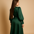 Opt for a refined look with this, a long dress with an accentuating waistband for women that effortlessly combines style and comfort. The flowing fit and long sleeves give this dress an elegant appearance, making it perfect for any season. The deep green color radiates luxury, making this dress ideal for weddings, galas, and other festive occasions.