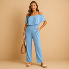 Discover this, an elegant off-shoulder summer jumpsuit for women featuring an airy fit and feminine flair. The loose-fitting design ensures ultimate comfort on warm days, while the soft, breathable fabric keeps you cool during any summer occasion. With its refined appearance, this is perfect for garden parties, beach days, or a casual chic look in the city.