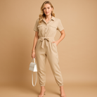 Make a statement with this, a tailored women's jumpsuit that perfectly combines comfort and style. The V-neck adds an elegant touch, while the cargo pockets provide a trendy and functional accent. The slim fit flatters the silhouette, making this jumpsuit ideal for both casual days and chic occasions. A versatile choice for those who want to look stylish and practical at the same time.