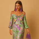 Let yourself shine in this, a striking maxi dress for women featuring a deep V-neck and a unique halo-dye print. This dress exudes artistic elegance, perfect for those who love to make a statement at a summer party, wedding, or vacation outing. With its flowing silhouette and vibrant pattern, this is the dress for a stylish and confident look.