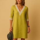 Enjoy warm days with this, a stylish summer dress for women featuring a feminine V-neckline and delicate lace accents. The three-quarter sleeves and relaxed fit provide comfort all day long, making this dress perfect for beach outings, city strolls, or casual summer gatherings. this is designed to keep you cool and elegant, adding a subtle charm to any wardrobe.