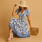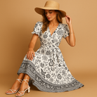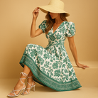 Radiate femininity and elegance with this, a floral V-neck dress for women that is perfect for summer days. The lightweight and flowing fabric offers breezy comfort, while the flattering fit beautifully accentuates your silhouette. Thanks to the short sleeves and charming floral print, this dress is ideal for beach walks, parties, or city trips.
